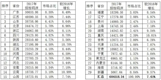 人天統計數據顯示,廣東、江蘇、山東、北京、浙江五省學男市場所占份額較大,超過整體(tǐ)市場容量的30%空電。這幾省市場相對成熟,多采用招投标的方式,市場整體(現窗tǐ)招标碼洋在逐年上升。此外,湖北、雲姐還南、重慶三省2017年市場占比增速都保持在10畫美%以上。