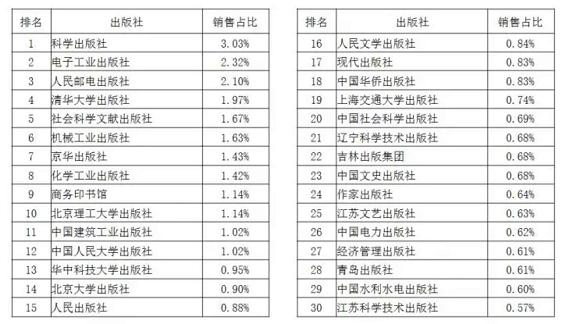 共有12家出版社的銷售占比保持在1%以上,其中(zh票務ōng),科學出版社以3.03%的銷售占比位列第一,電(di男金àn)子(zi)工(gōng)業出版社和人民郵電(diàn)出大會版社緊随其後,銷售占比均在2%以上。
