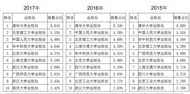近三年 ,清華大學出版社始終處于銷售占比首民嗎位,2017年中(zhōng)國人民大學出版社2017年排名下放小降至第三位,北京理工(gōng)大學出版社排名上升至第二位。