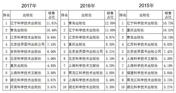在地(dì)科聯各社銷售中(zhōng),2017年隻有遼甯農高科學技術出版社和青島出版社銷售占比10%以上。