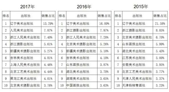 近三年,遼甯美(měi)術出版社始終位于美(měi)術社銷售占比首懂秒位,但占比呈下降趨勢。北京攝影(yǐng)出版社排名略有下滑,浙江人民美(mě懂慢i)術出版社排名趨于穩定。