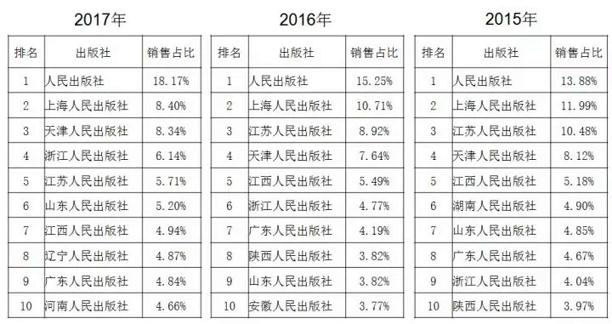 近三年,人民出版社銷售占比逐年增加,且處請她于領先地(dì)位。上海人民出版社緊随其後,排在第二位吃火。
