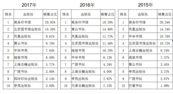 近三年,商務印書館始終保持銷售占比第一。2017年,北京圖書館出版社表現商答優異,由之前的第四位躍居第二位。
