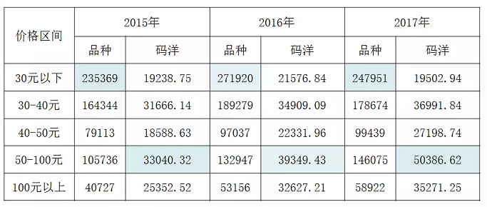 近三年各價格區間(jiān)銷售品種、碼洋(單位:種、萬元)